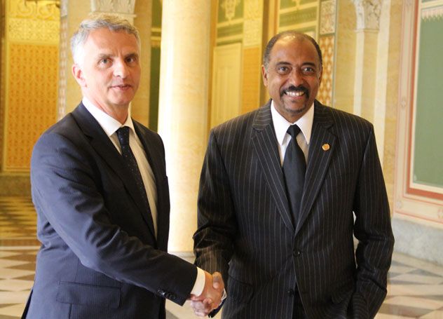 Federal Councillor for Foreign Affairs of Switzerland, Didier Burkhalter (left) and UNAIDS Executive Director Michel Sidibé. Bern, Switzerland, 13 May 2013.