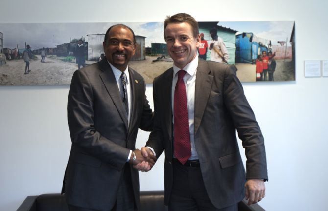 El director ejecutivo de ONUSIDA Michel Sidibé (izquierda) y el Ministro de Desarrollo danés Christian Friis Bach en la sede de ONUSIDA en Ginebra. 27 de febrero de 2013. Fotografía: ONUSIDA