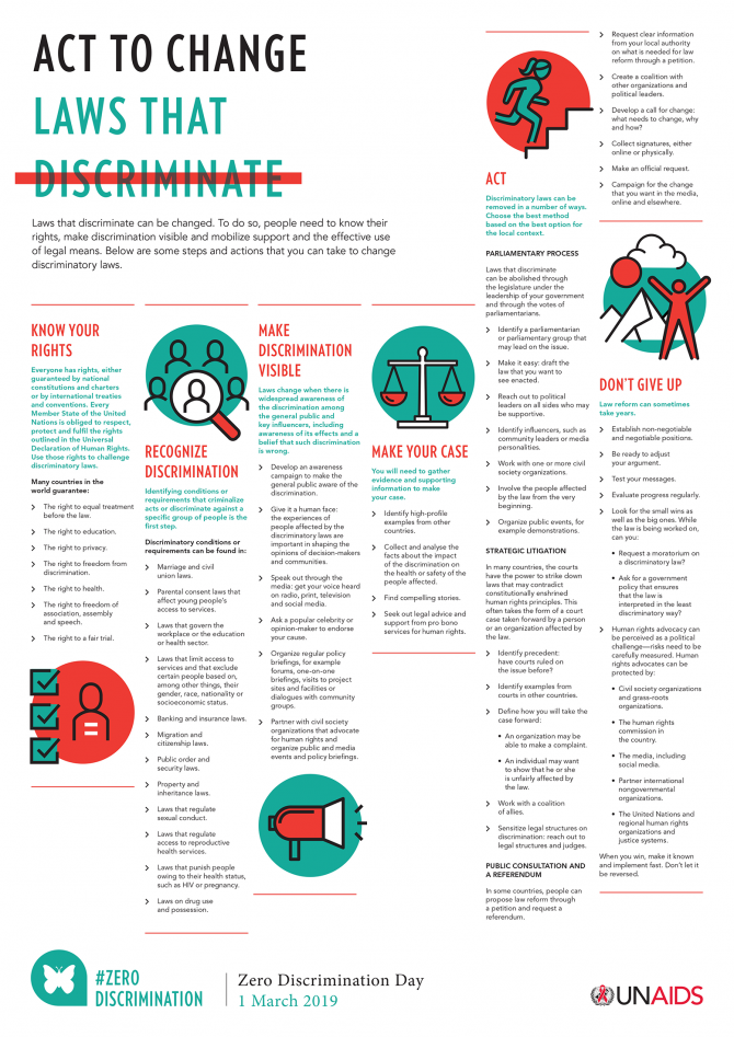 Laws that discriminate can be changed. To do so, people need to know their rights, make discrimination visible and mobilize support and the effective use of legal means. Below are some steps and actions that you can take to change discriminatory laws.