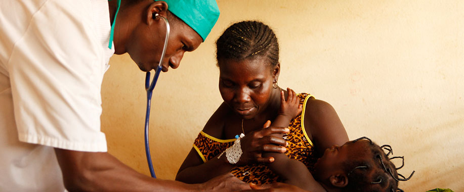 A health care worker examines a child in l’Auberge de l’Amour Rédempteur clinic, Benin. The clinic benefits from Global Fund financing for antiretroviral and other HIV-related medicines, HIV testing, medical personnel and training of health workers.