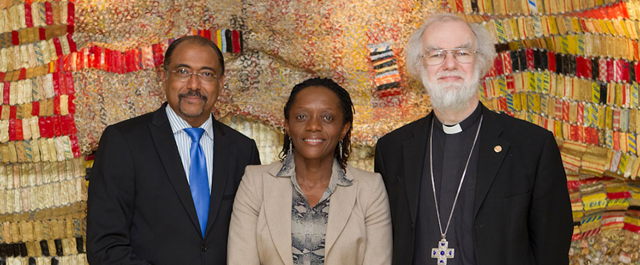 L to R: UNAIDS Executive Director Michel Sidibé, Advocacy Officer with Christian Aid Winnie Ssanyu Sseruma, Archbishop of Canterbury Dr Rowan Douglas Williams. UNAIDS offices in Geneva, Switzerland. 29 February 2012.
