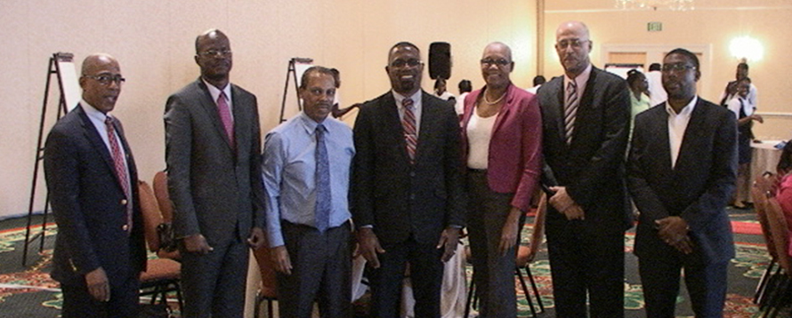 Специальный посланник Генерального секретаря ООН по ВИЧ/СПИДу в Карибском регионе профессор Джон Эдвард Грин (на снимке — третий слева) с членами парламентов стран региона во время мероприятия, посвященного запуску программы Justice for All («Справедливость для всех»).