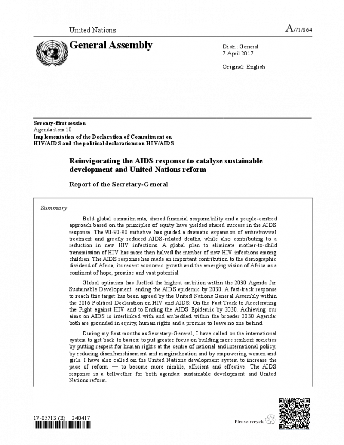 Report of the UN Secretary-General on the Implementation of the Declaration of Commitment on HIV/AIDS and the political declarations on HIV/AIDS (72nd session of the General Assembly)