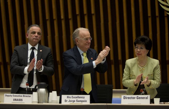 15 April 2013 15 April 2013A special event to celebrate former President of Portugal Dr Jorge Sampaio’s commitment and dedication to raising the profile of public health and tuberculosis took place at the World Health Organization’s premises in Geneva on 15 April 2013. WHO Director-General, Dr Margaret Chan, the Executive Director of the Global Fund to fight AIDS, Tuberculosis and Malaria, Mark Dybul and the UNAIDS Deputy Executive Director, Programme, Dr Luiz Loures among others honoured Dr Sampaio for his efforts to advocate among global leaders for improved tuberculosis control. A discussion about the future of high-level political advocacy followed the initial remarks.