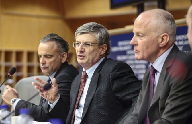Left to right: Luiz Loures, UNAIDS Deputy Executive Director for Programme; Toni Borg, European Health Commissioner; and Michael Cashman, Member of European Parliament.