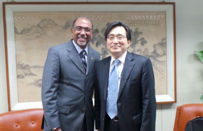 UNAIDS Executive Director Michel Sidibé (left) met with Republic of Korea's Deputy Foreign Minister for Multilateral Affairs, Shin Dong-ik. Seoul, 29 October 2013. Credit: UNAIDS