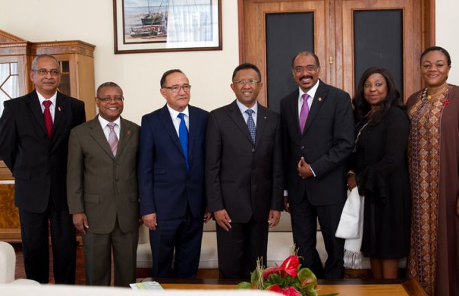 UNAIDS Executive Director Michel Sidibé (third from right) paid a visit to the President of the Republic of Madagascar (middle) on 16 April 2014.