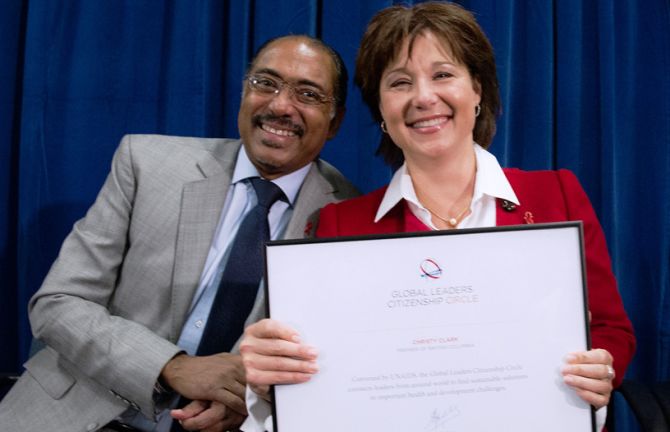 UNAIDS Executive Director with Christy Clark, Premier, Government of British Columbia, upon the Premier’s introduction to the UNAIDS Global Leaders Citizenship Circle.