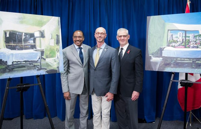UNAIDS Executive Director; Tiko Kerr, artist living with HIV; and Julio Montaner, Director, BC Centre for Excellence in HIV/AIDS; upon presentation of two paintings by Tiko Kerr depicting the changes in 10-C Ward at St. Paul’s Hospital in Vancouver.