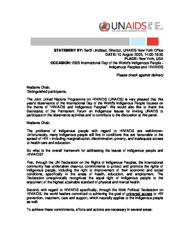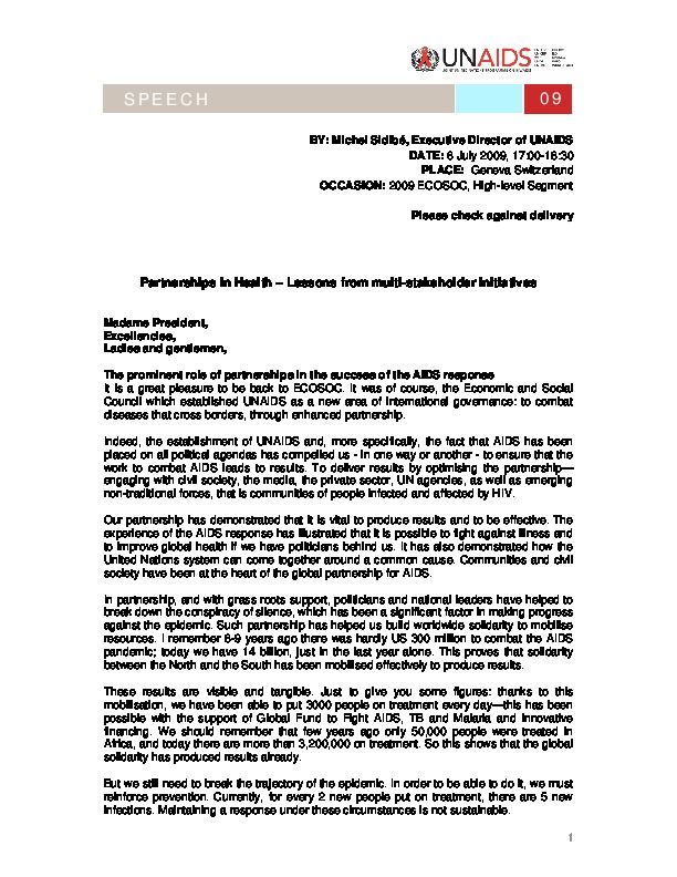 "Partnerships in Health – Lessons from multi-stakeholder initiatives" Speech by Michel Sidibé, Executive Director of UNAIDS to 2009 ECOSOC, High-level Segment, 6 July 2009