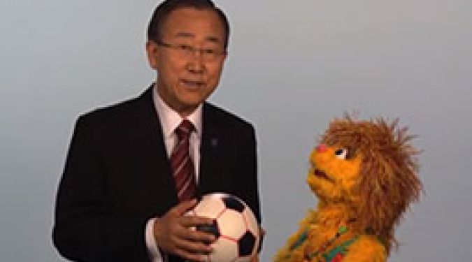 La muppet seropositiva Kami y el secretario general de las Naciones Unidas Ban Ki-Moon promueven la salud de mujeres y niños