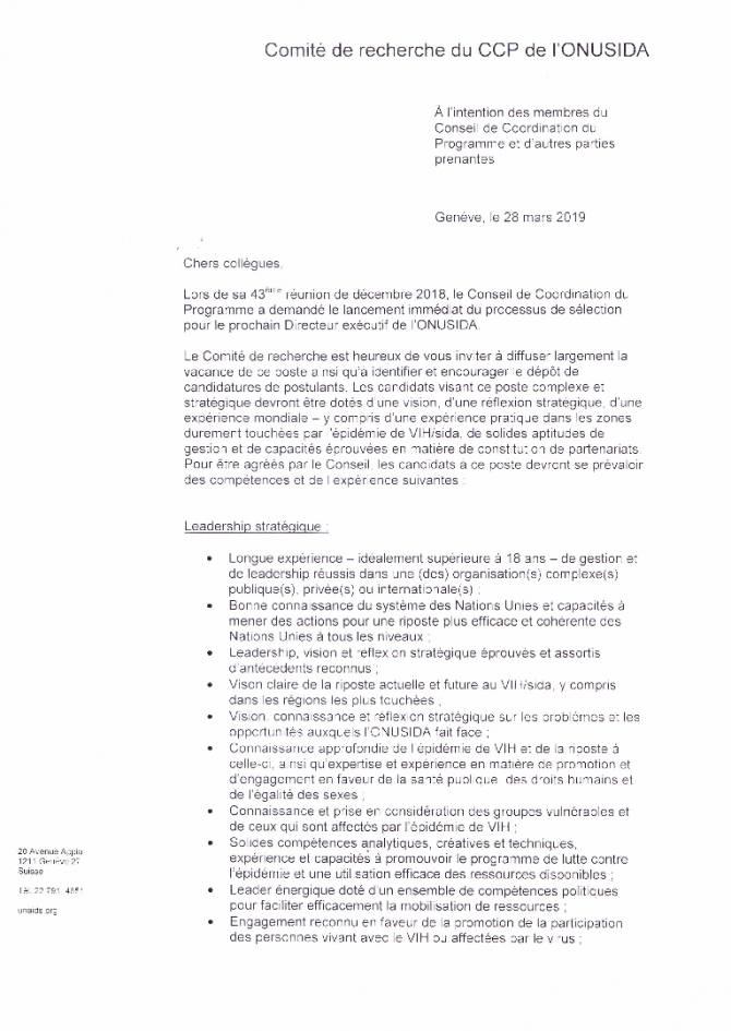Lettre révisée suite à Session spéciale du CCP: dépôt des candidatures au poste de Directeur exécutif de l'ONUSIDA