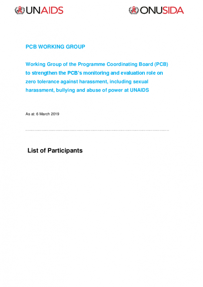 List of Participants - Working Group of the Programme Coordinating Board (PCB) to strengthen the PCB’s monitoring and evaluation role on zero tolerance against harassment, including sexual harassment, bullying and abuse of power at the UNAIDS Secretariat