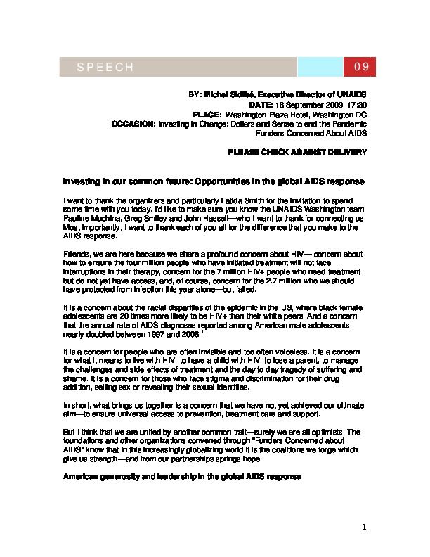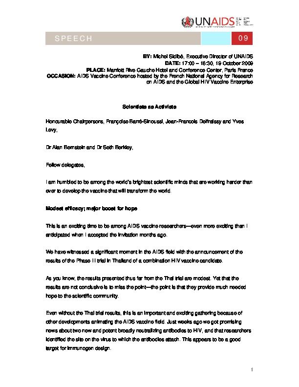 Speech by Michel Sidibé, Executive Director of UNAIDS, to the 2009 AIDS Vaccine Conference