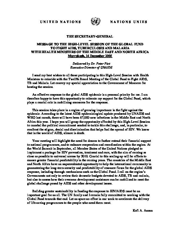 MESSAGE 0F THE UN SECRETARY GENERAL TO THE HIGH-LEVEL SESSION OF THE GLOBAL FUND TO FIGHT AIDS, TUBERCULOSIS AND MALARIA WITH HEALTH MINISTERS OF THE MIDDLE EAST AND NORTH AFRICA