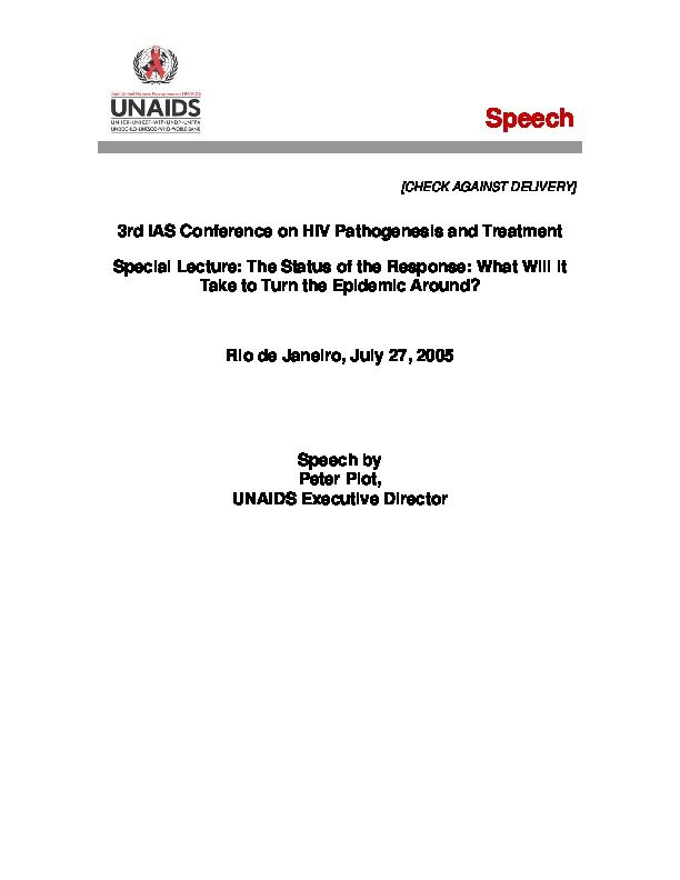 The Status of the Response: What Will it Take to Turn the Epidemic Around?; Special Lecture to the 3rd IAS Conference on HIV Pathogenesis and Treatment, by Peter Piot, UNAIDS Executive Director, Rio de Janeiro, 27 July 2005