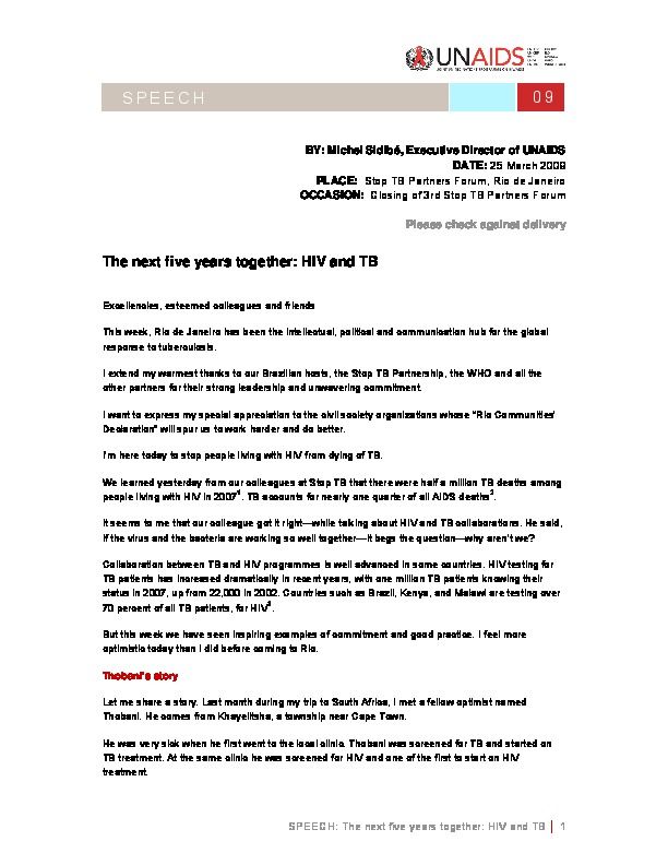 "The next five years together: HIV and TB" - Speech by UNAIDS Executive Director Michel Sidibé