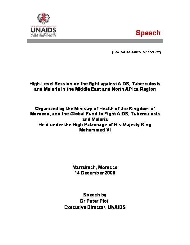 Speech by Dr Peter Piot, Executive Director, UNAIDS at High-Level Session on the fight against AIDS, Tuberculosis and Malaria in the Middle East and North Africa Region