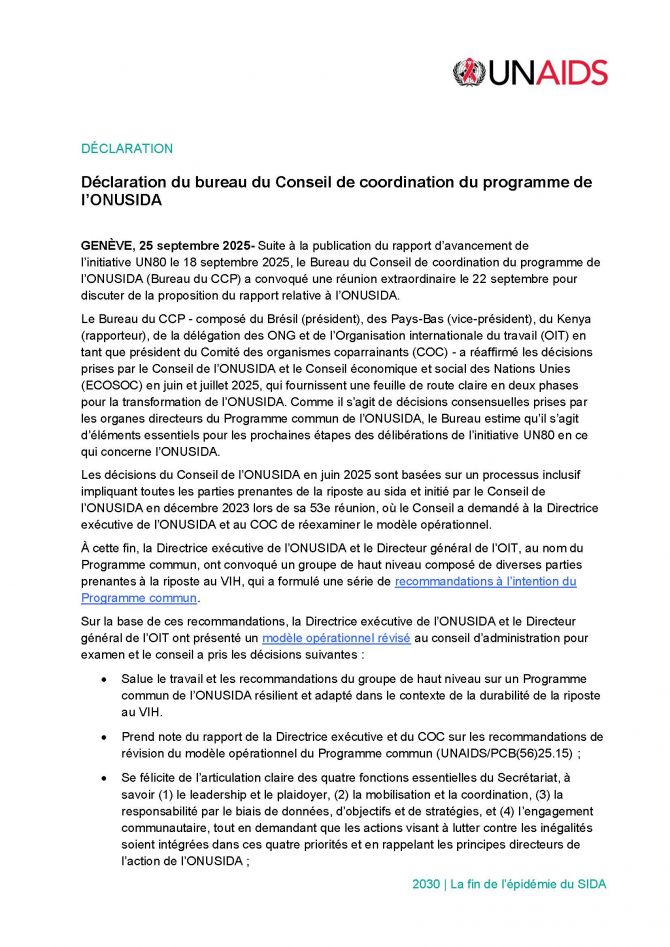 Déclaration du Bureau du CCP de l’ONUSIDA