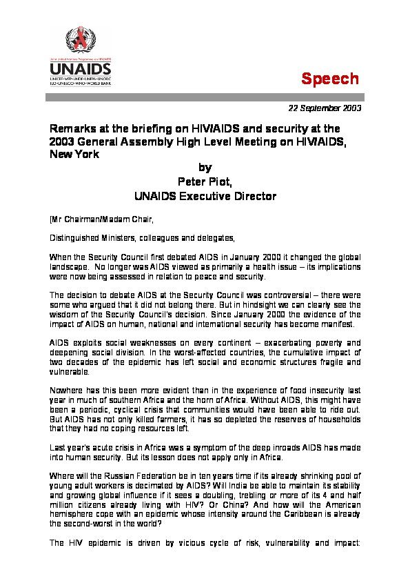 Remarks at the briefing on HIV/AIDS and security at the 2003 General Assembly High Level Meeting on HIV/AIDS, New York