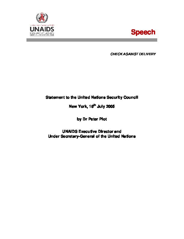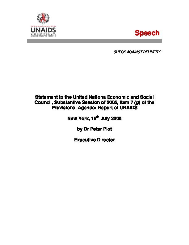 Statement to the United Nations Economic and Social Council, Substantive Session of 2005, Item 7 (g) of the Provisional Agenda: Report of UNAIDS, New York, 19th July 2005 by Dr Peter Piot, Executive Director