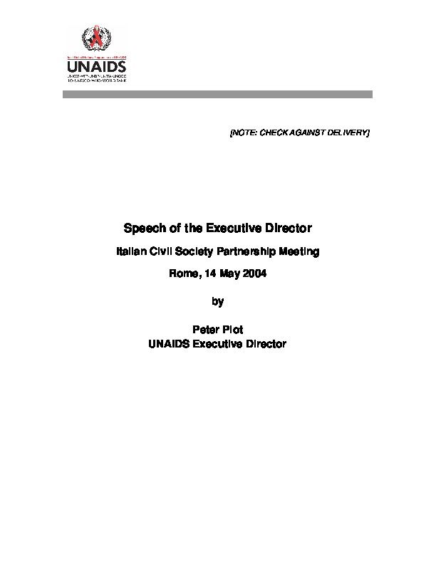 Speech of the Executive Director Italian Civil Society Partnership Meeting, Rome, 14 May 2004, by Peter Piot, UNAIDS Executive Director