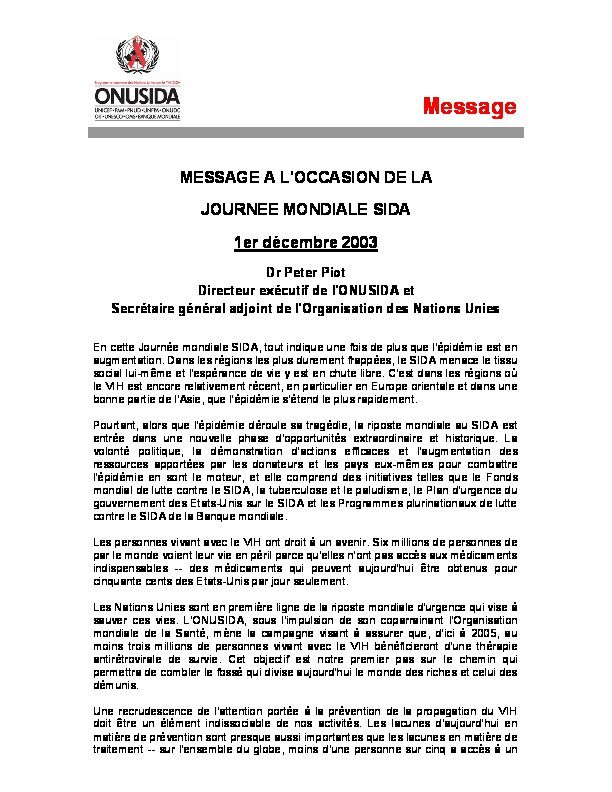 MESSAGE A L'OCCASION DE LA JOURNEE MONDIALE SIDA 1er décembre 2003, Dr Peter Piot Directeur exécutif de l'ONUSIDA et Secrétaire général adjoint de l'Organisation des Nations Unies