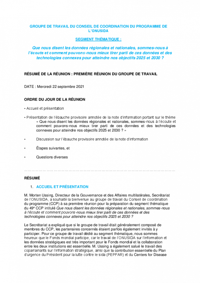 Résumé de la première réunion du groupe de travail sur le segment thématique