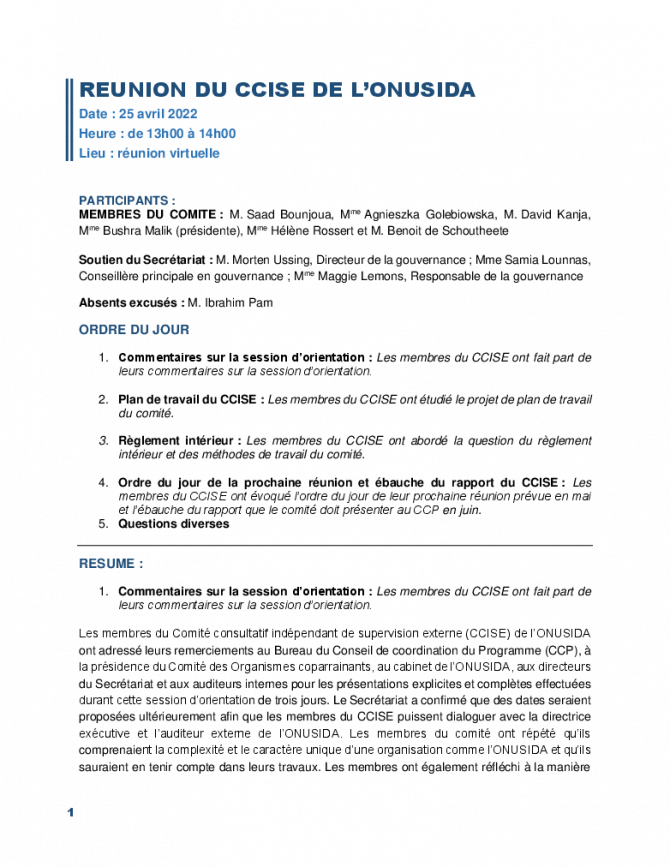 CCISE de l'ONSUDA: Réunion: 25 avril 2022