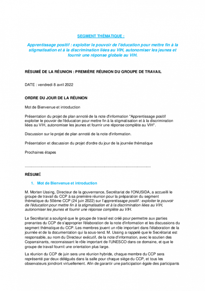 Résumé de la première réunion du groupe de travail du segment thématique du CCP0