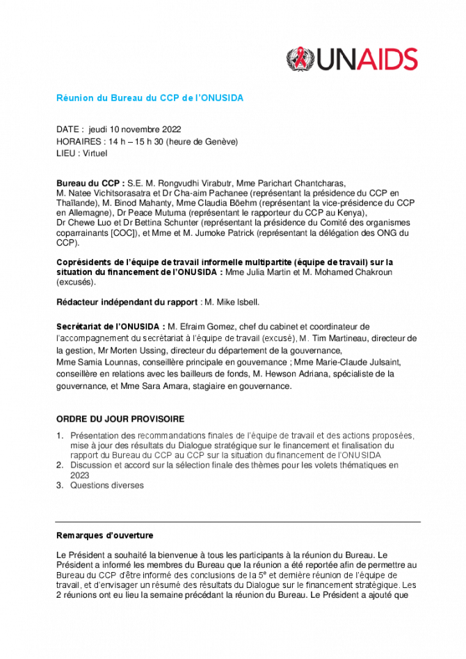 Réunion du Bureau du CCP de l’ONUSIDA 10 novembre 2022