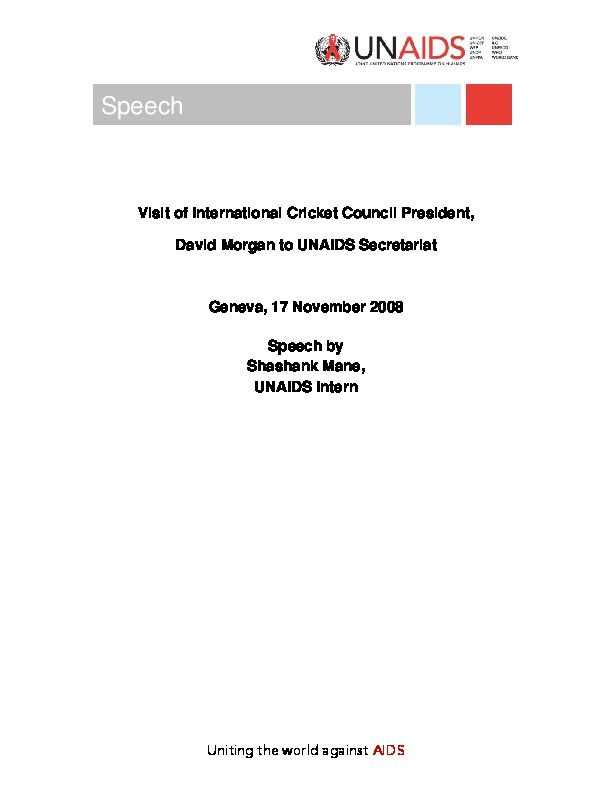 Speech by Shashank Mane, UNAIDS Intern on the occassion of the visit of International Cricket Council President, David Morgan to UNAIDS Secretariat. Geneva, 17 November 2008