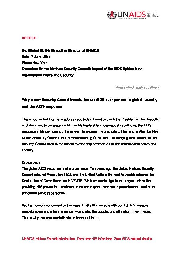 UNAIDS Executive Director's Speech at the United Nations Security Council: Impact of the AIDS Epidemic on International Peace and Security