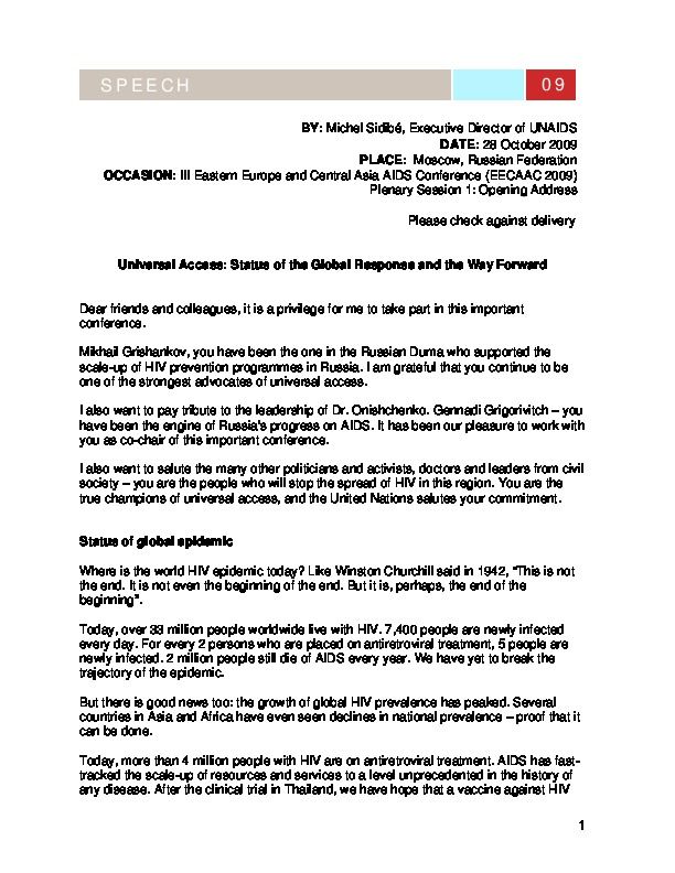 Opening address to 3rd Eastern Europe and Central Asia AIDS Conference (EECAAC 2009), by Michel Sidibé