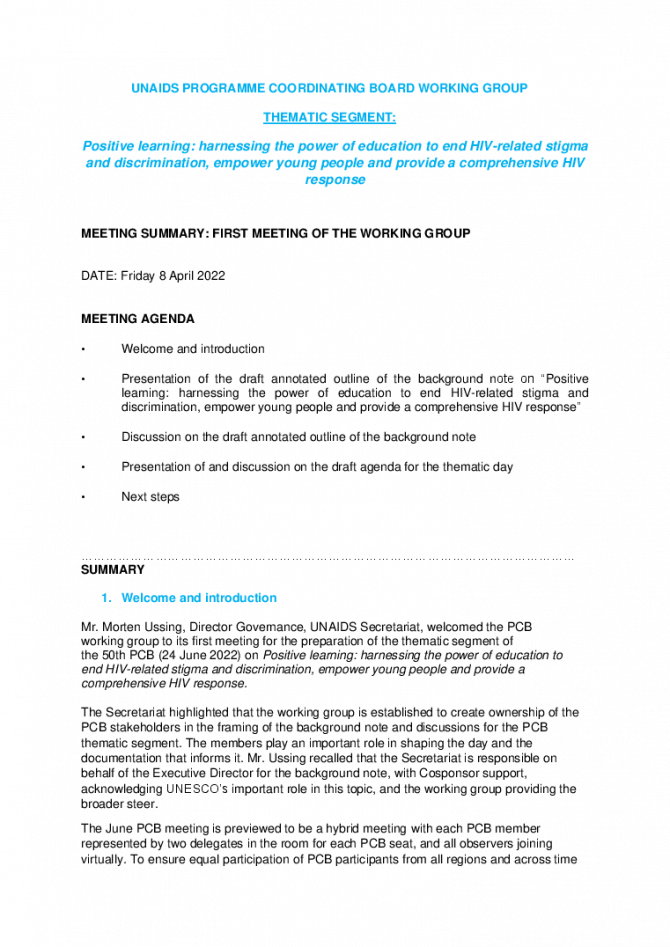 Summary of the first meeting of the PCB50 Thematic Segment Working Group