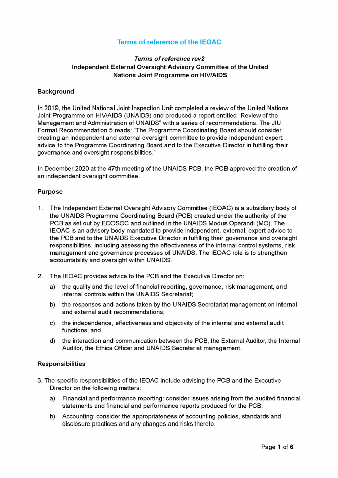Terms of Reference: UNAIDS Independent External Oversight Advisory Committee