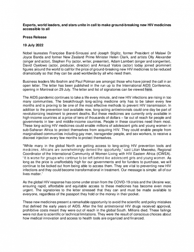 Experts, world leaders, and stars unite in call to make ground-breaking new HIV medicines accessible to all