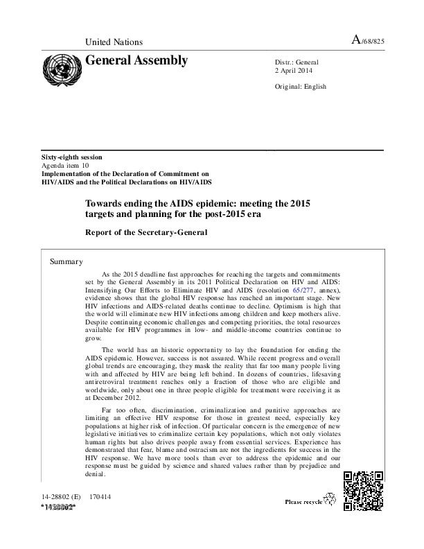 Report of the UN Secretary-General on the Implementation of the Declaration of Commitment on HIV/AIDS and the political declarations on HIV/AIDS (Seventy-third session of the General Assembly) 2 April 2019 - A/73/824