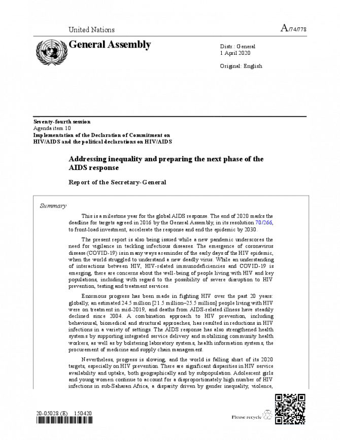 Report of the UN Secretary-General on the Implementation of the Declaration of Commitment on HIV/AIDS and the political declarations on HIV/AIDS (Seventy-fourth session of the General Assembly) 1 April 2020 - A/74/778