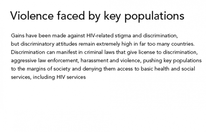 27 January 2020 27 January 2020Gains have been made against HIV-related stigma and discrimination, but discriminatory attitudes remain extremely high in far too many countries. Discrimination can manifest in criminal laws that give license to discrimination, aggressive law enforcement, harassment and violence, pushing key populations to the margins of society and denying them access to basic health and social services, including HIV services.