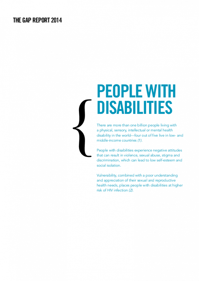 There are more than one billion people living with a physical, sensory, intellectual or mental health disability in the world—four out of five live in low- and middle-income countries. People with disabilities experience negative attitudes that can result in violence, sexual abuse, stigma and discrimination, which can lead to low self-esteem and social isolation. Vulnerability, combined with a poor understanding and appreciation of their sexual and reproductive health needs, places people with disabilities at higher risk of HIV infection.
