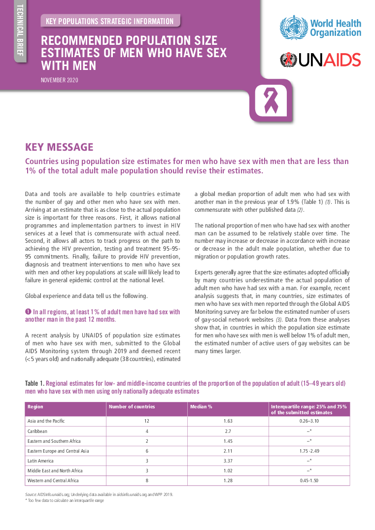 Men who have sex with men are a key population in the global response to HIV. Global targets are for 95% of men who have sex with men to be reached by HIV prevention, diagnosis and treatment services by 2025. To monitor progress to these important targets, estimates of the number of men who have sex with men need to be as close to the true number as possible. Many countries currently underestimate the number of men who have sex with men due to structural issues that make recommended population size estimate methods difficult to carry out. However, data from those countries with valid and sound estimates reported through the Global AIDS Monitoring system show that at least 1% of all adult men have had sex with another man in the last one year, regardless of which region of the world the estimates come from. WHO and UNAIDS recommend that countries adjust size estimates of men who have sex with men to ensure that the estimated number of adult men who have sex with men is at least 1% of all adult men and to use revised estimates for planning and monitoring services.