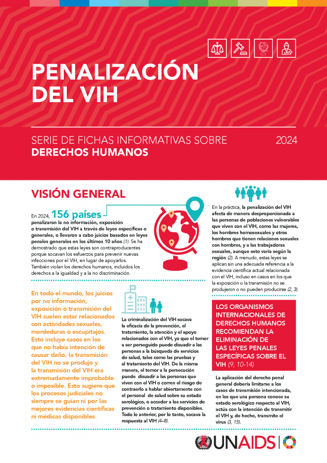 La Estrategia Mundial sobre el Sida 2021-2026 tiene objetivos ambiciosos y cruciales acerca de la aplicación de los derechos humanos, la reducción de la estigmatización, la discriminación y la violencia y la eliminación de las leyes punitivas perjudiciales como vía para acabar con las desigualdades y, en última instancia, con el sida. ONUSIDA ha creado una serie de folletos informativos sobre derechos humanos en diversas áreas, destacando la necesidad crítica de ampliar la acción en materia de derechos humanos para contribuir en la aplicación de las intervenciones para eliminar las barreras sociales. Se trata de una serie de documentos breves, fáciles de comprender y accesibles, en los que se detallan los últimos detalles epidemiológicos, las pruebas del impacto de las intervenciones en materia de derechos humanos, los objetivos más recientes y las directrices, recomendaciones y obligaciones internacionales relacionados con derechos humanos respecto a cada tema. Folletos publicados en junio de 2021: La penalización del VIH, El VIH y las personas que consumen drogas, El VIH, y los hombres homosexuales y los hombres que mantienen relaciones sexuales con hombres, El VIH, y las personas transgénero y las personas de género diverso, El VIH y el trabajo sexual, El VIH y las personas recluidas en centros penitenciarios y otros lugares de reclusión, El VIH, y el estigma y la discriminación. Cuatro folletos adicionales se publicarán a lo largo del año.