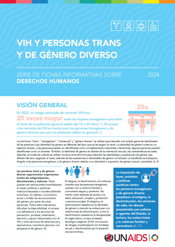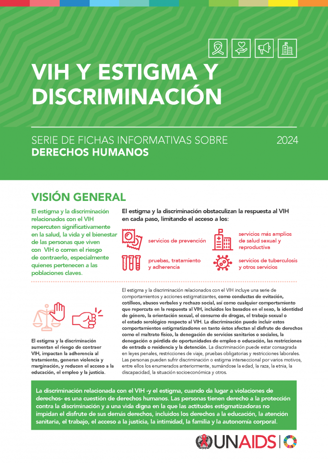 El VIH, y el estigma y la discriminación — Serie de folletos…Read more El VIH y las personas recluidas en centros penitenciarios y otros…Read more El VIH y el trabajo sexual — Serie de folletos informativos sobre…Read more El VIH, y las personas transgénero y las personas de género diverso —…Read more Ver todo