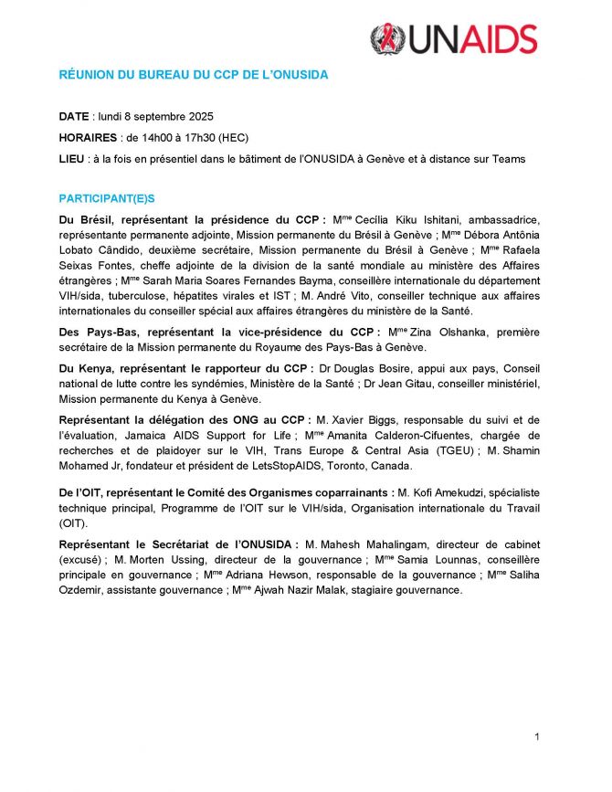 Réunion du Bureau du CCP de l’ONUSIDA 8 septembre 2025