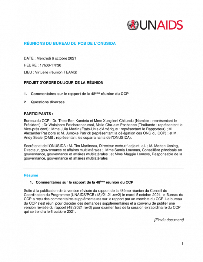 Bureau du CCP de l'ONUSIDA 6 octobre 2021