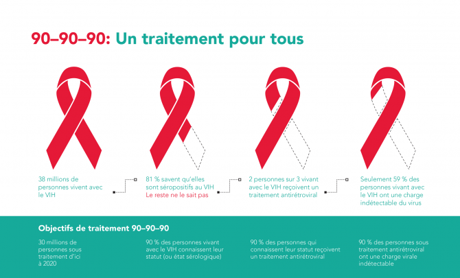 38 millions de personnes vivent avec le VIH. 81 % savent qu'elles sont séropositifs au VIH. Le reste ne le sait pas. 2 personnes sur 3 vivant avec le VIH reçoivent un traitement antirétroviral. Seulement 59 % des personnes vivant avec le VIH ont une charge indétectable du virus.