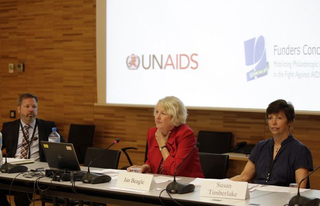 De gauche à droite : John Barnes, Directeur général, Funders Concerned about AIDS ; Directrice exécutive adjointe de l'ONUSIDA Jan Beagle et Susan Timberlake, Chef de la Division des droits de l'homme de l'ONUSIDA.
