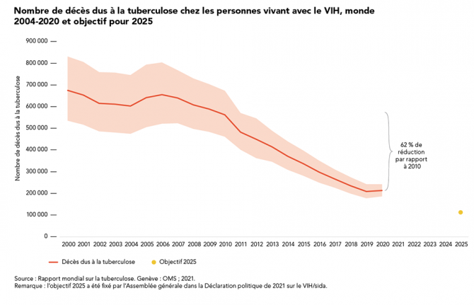 On estime à 214 000 le nombre de décès dus à la tuberculose en 2020 chez les personnes vivant avec le VIH, soit une baisse de 62 % depuis 2010, année à laquelle la tuberculose a provoqué la mort de 563 000 personnes séropositives. Entre 2019 et 2020, le nombre estimé de décès dus à la tuberculose chez les personnes vivant avec le VIH a augmenté pour la première fois depuis 2006, il était de 209 000 en 2019. La Déclaration politique des Nations Unies de 2021 sur le sida fixe l’objectif d’une réduction de 80 % d’ici 2025 (par rapport à 2010).