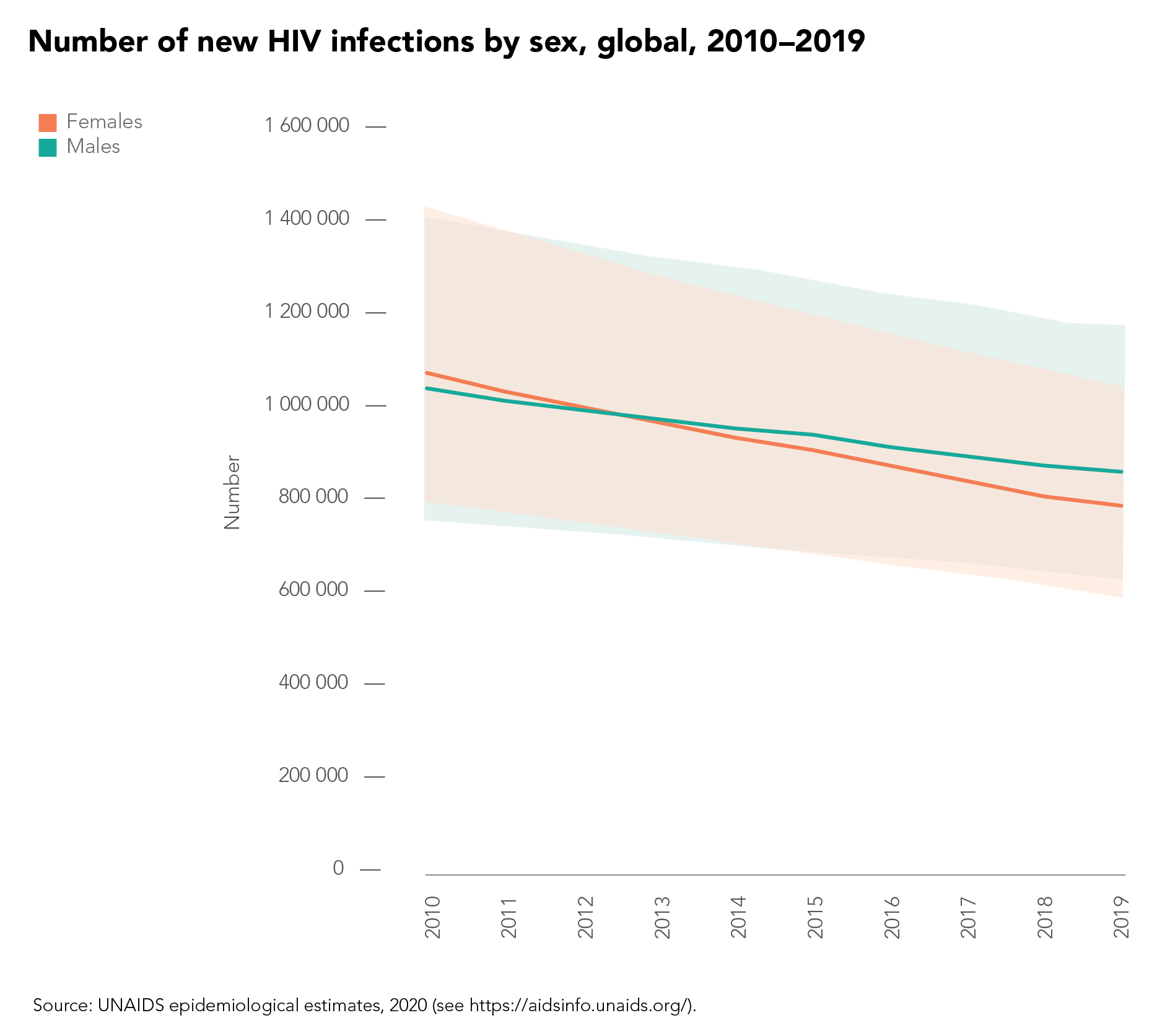 В 2019 году во всем мире насчитывалось меньше новых случаев инфицирования ВИЧ среди женщин и девочек (48% от общего числа случаев инфицирования), чем среди мужчин и мальчиков (52%). Во всем мире ежегодное число новых случаев инфицирования сокращалось быстрее среди женщин и девочек (на 27% по сравнению с 2010 годом), чем среди мужчин и мальчиков (на 18% по сравнению с 2010 годом).